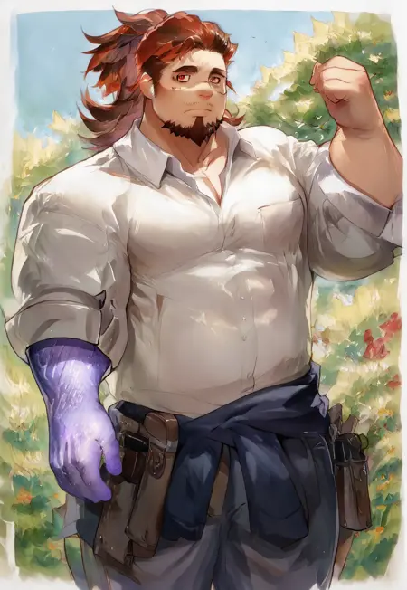 bara, musclegut, brown hair, multicolored hair, two-tone hair, long hair, ponytail, ponytail hair, undercut, thin mustache, facial hair, goatee, red eyes, tired eyes, eyebags, face scar, scar across nose, purple right arm, magical right arm,