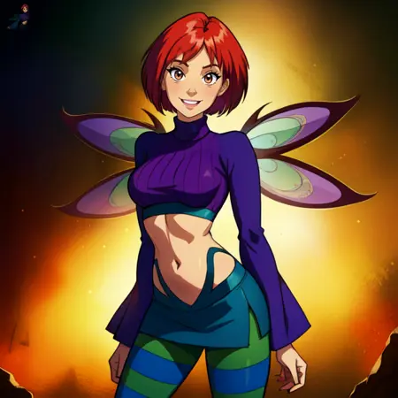 midriff, green-blue striped pantyhose, purple turtleneck, or pink turtleneck with wide sleeves, navel, miniskirt, or teal miniskirt, purple boots,