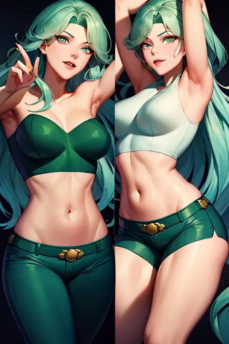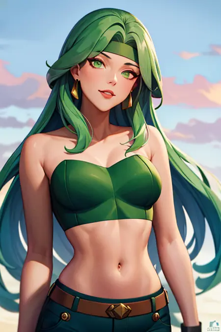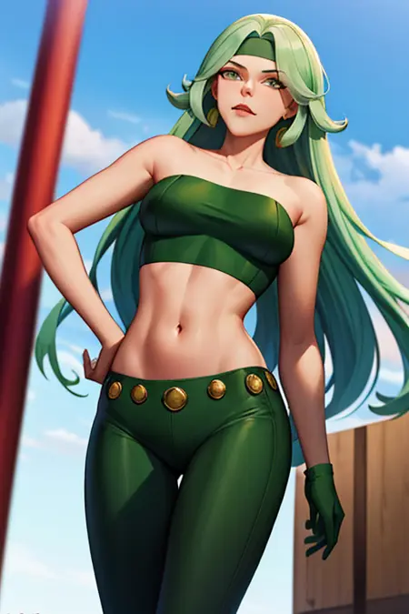 This lora is flexible so if you don’t include her outfit in the prompt she’ll end up with different clothes.