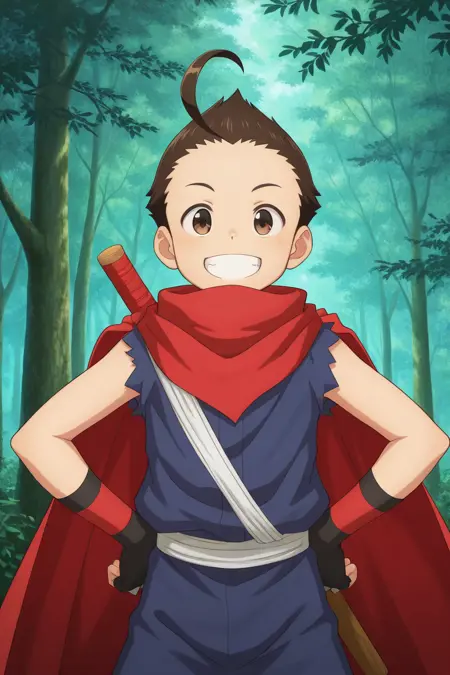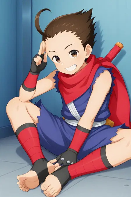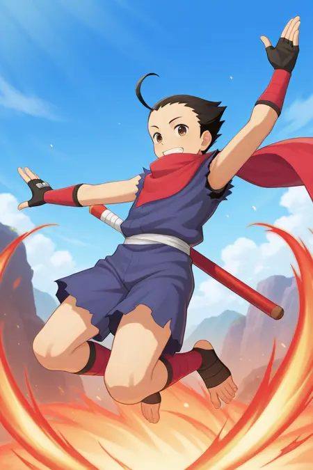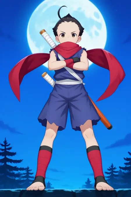 *hokutomaru,黑发,棕眼,忍者,红围巾,无指手套,无脚趾裤袜,蓝衬衫,蓝短裤,无袖,脚踝绑带,