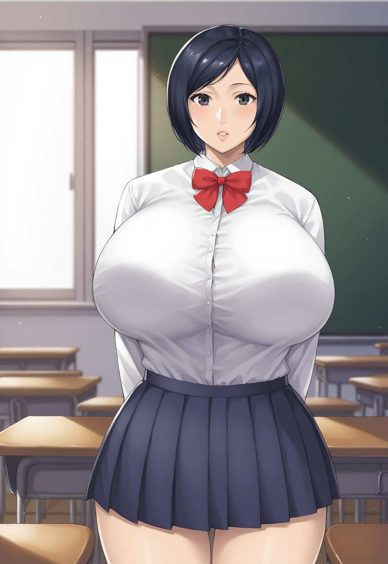 Tags: Emiko Suguri, dark blue hair, short hair, bob cut hair style, black eyes, huge breasts