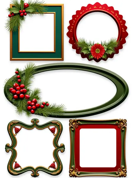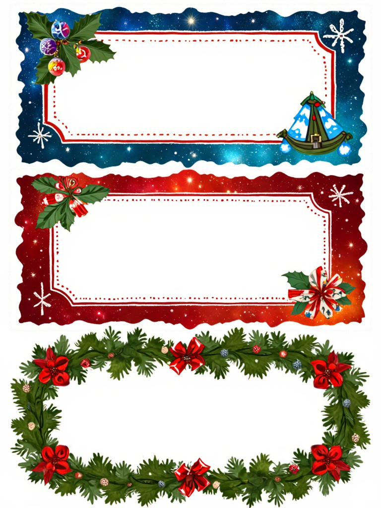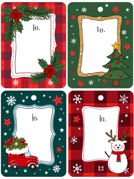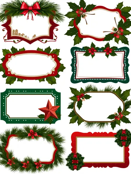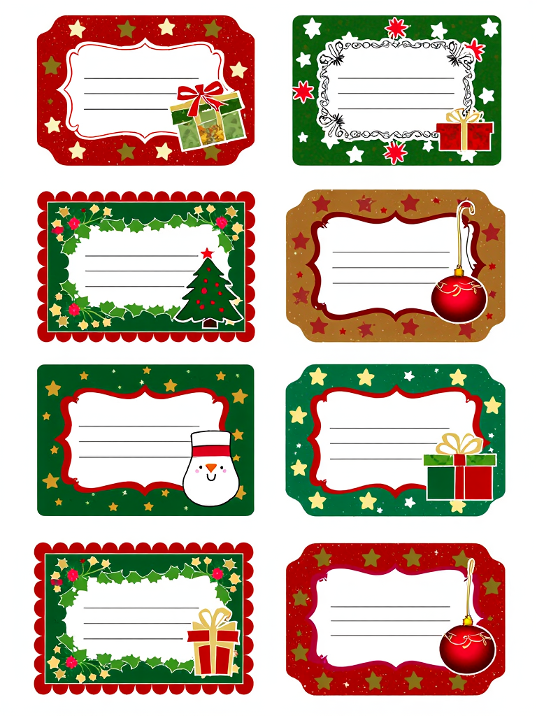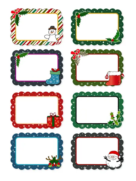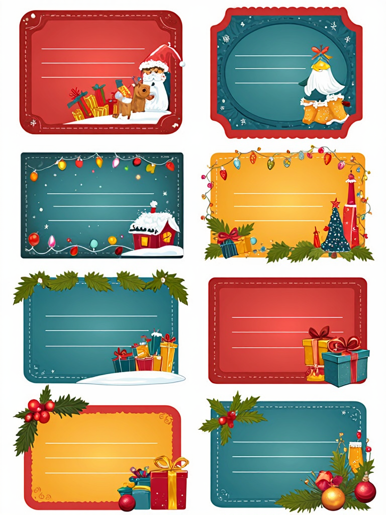示例提示:Christmas Label Tags 4x2 grid layout, lines, colorful christmas frames with a christmas icon on the side. empty text, no text}. White background.