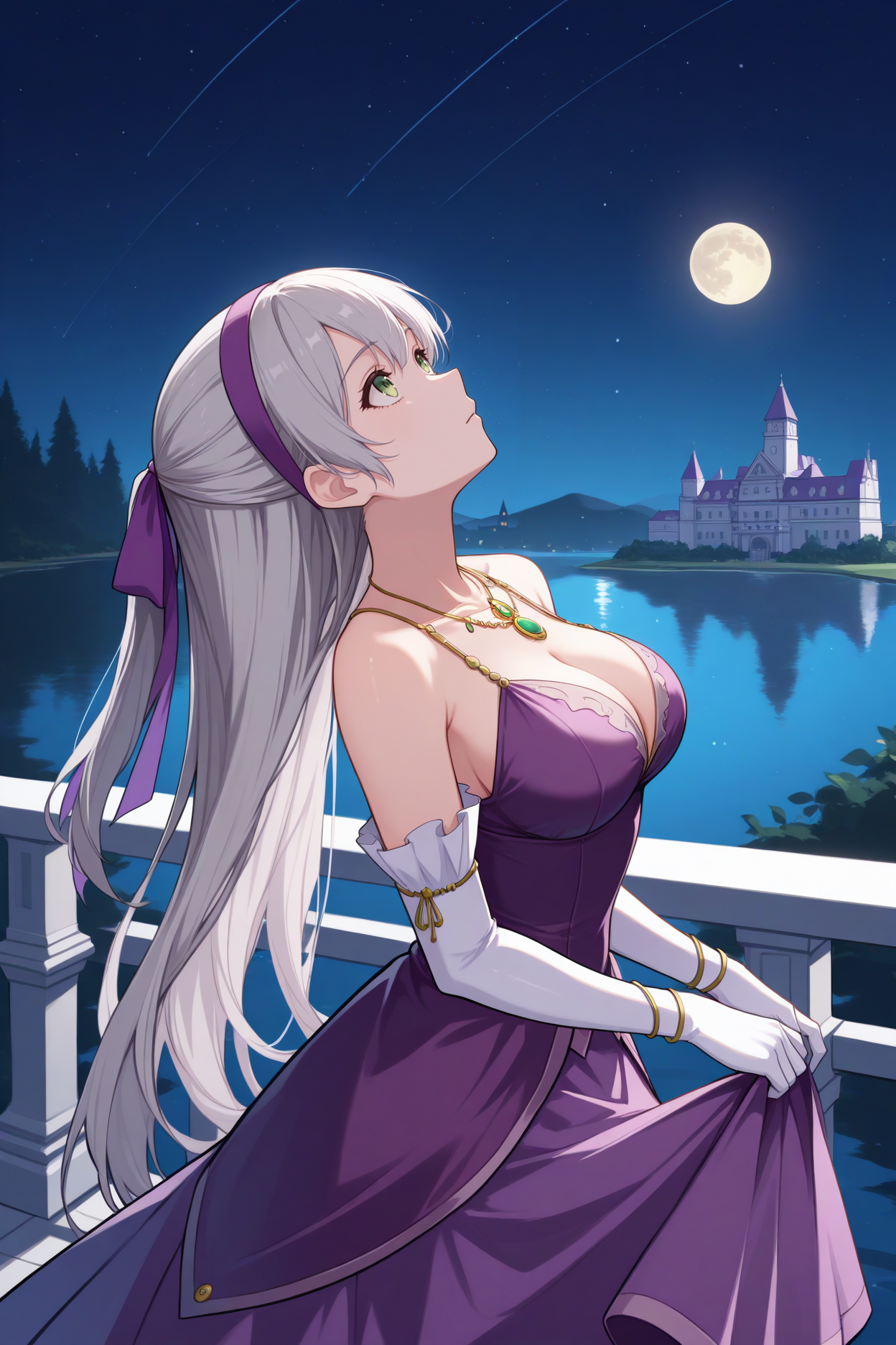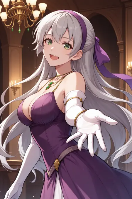 Add "fmlelie, grey hair, long hair, half updo, green eyes, purple hairband, purple ribbon, necklace, purple dress, cleavage, bare shoulders, white gloves, elbow gloves" for her Zero formal dress.