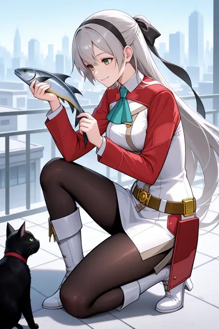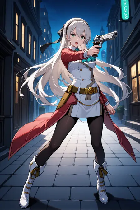 Add "zrelie, grey hair, long hair, half updo, green eyes, black hairband, hair ribbon, white and red uniform, white dress, aqua ascot, brown belt, black pantyhose, white boots" for her typical look.