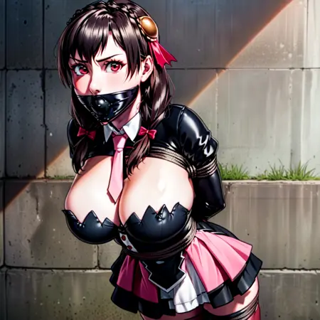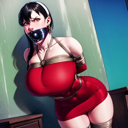 stffed_Tape_gag, 1girl, bdsm, bondage, bound arms, damsel in distress, bound, (arms behind back), shibari_over_clothes