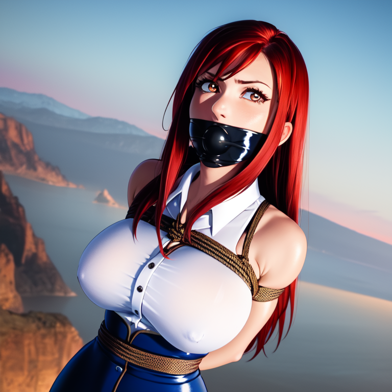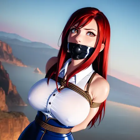 stffed_Tape_gag, 1girl, bdsm, bondage, bound arms, damsel in distress, bound, (arms behind back), shibari_over_clothes
