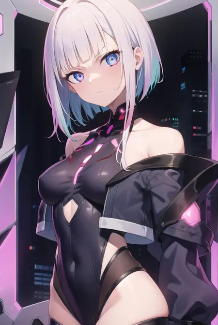 lucy, asymmetrical hair, cyberpunk, cyborg, gradient hair, medium hair, multicolored hair, parted bangs, pink hair, (white hair:1.2), (pink eyes:1.5),