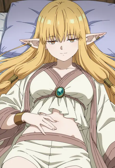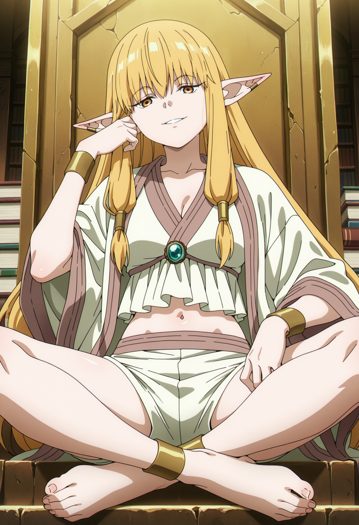 长袍:selie,1个女孩,动漫着色,复古艺术风格,单人,长发,金发,尖耳,selie耳环,发管,黄眼睛,上挑眼,低绑侧发,selie衬衫,白色长袍,宝石,长袖,selie白色短裤,手镯,中等大小乳房,肚脐,