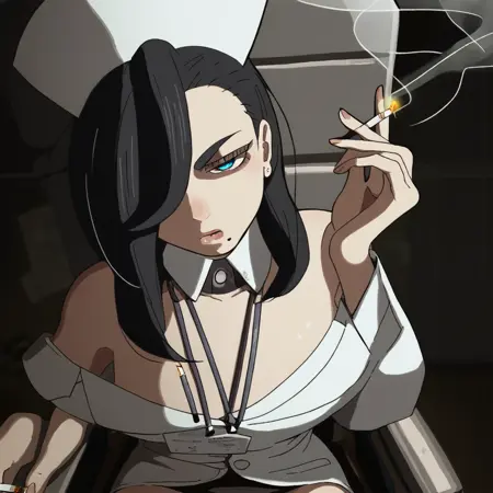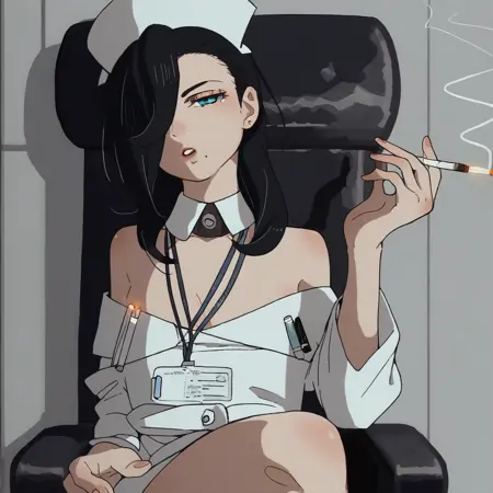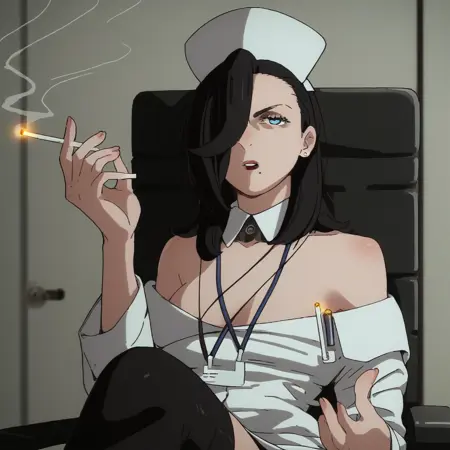 JooDandadanNurseV1, hair over one eye, nurse, nurse outfit, nurse hat, hat, mole, nurse cap, jewelry, earrings, blue eyes, nurse,