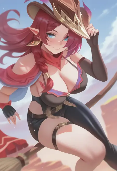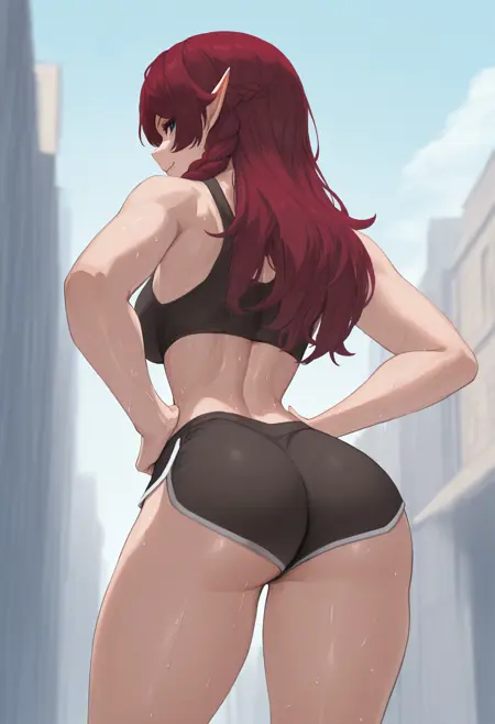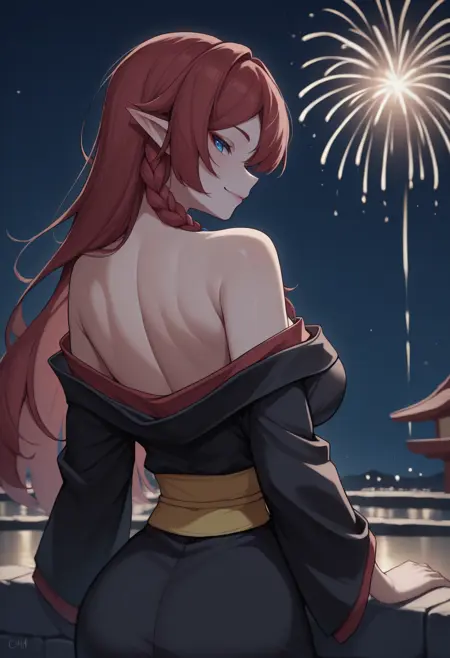 Trigger + Appearance: ch4sca, long hair, red hair, side braid, pointy ears, blue eyes, large breasts