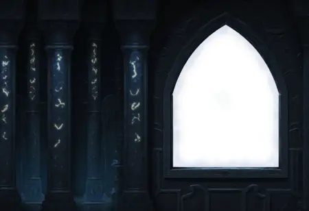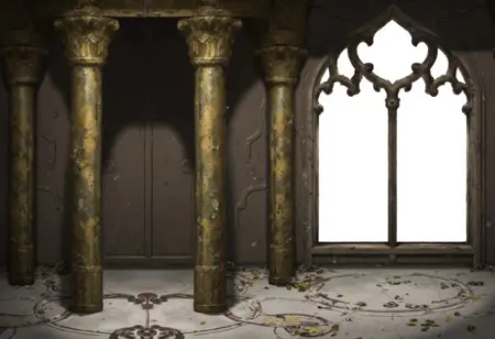 오른쪽에, 천장에서 바닥까지 이어지는 큰 창이 단단한 흰색 배경을 드러내며, 창 자체는 얇은 은색 테두리가 있는 챔퍼 처리된 검은 프레임으로 둘러싸여 있습니다.