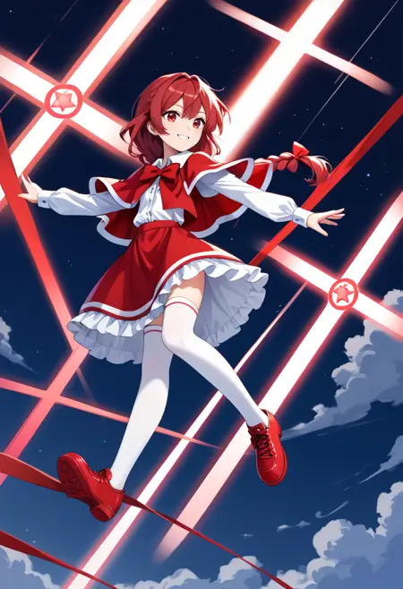 --> 1girl, okazaki yumemi, red hair, bow, red eyes, long hair, braid, red skirt, red vest, white shirts, long sleeves, red ribbons, red capelet, cross_background, hexagram