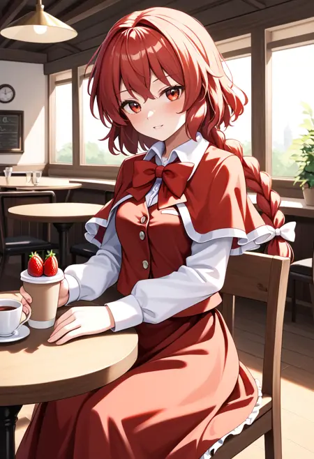 --> 1girl, okazaki yumemi, red hair, bow, red eyes, long hair, braid, red skirt, vest, white shirts, long sleeves, red capelet, red ribbon