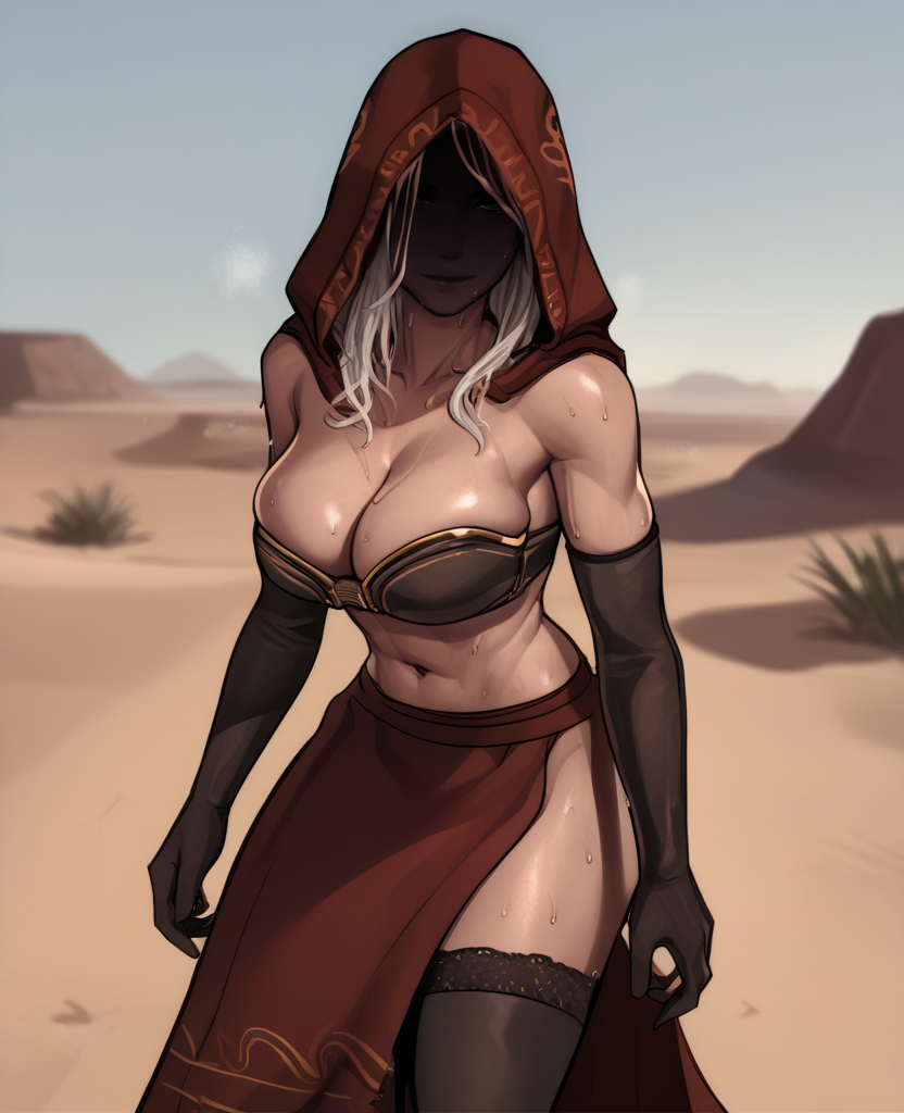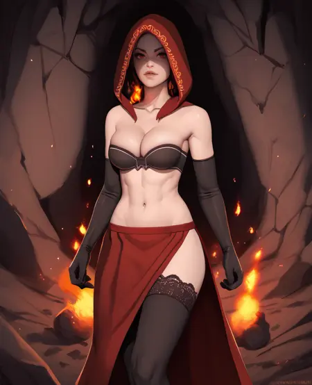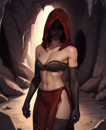肘まで手袋、赤いフード、腹部またはへそ、茶色のストラップレスブラ、ブラックのパンツ、レース縁の太ももブーツ、赤いスカート、胸元、裸の肩。