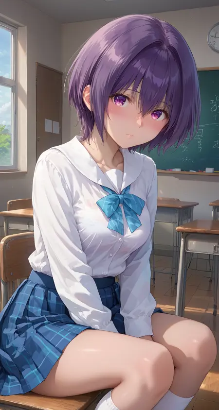 캐릭터: 사쿠라 테라마치, 단발, 눈 사이의 머리카락, 보라색 머리, 보라색 눈,
