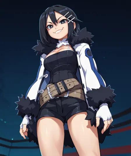 毛边外套,或白色外套配黑色毛边,露胸,白色毛领,兜帽下垂,——白色无指手套,——过膝袜,黑色短裤,腰带,——长袖,——黑色上衣,无袖,或露肩,
