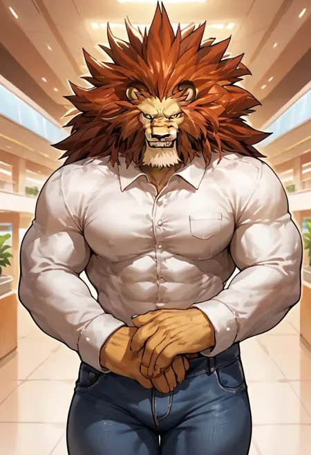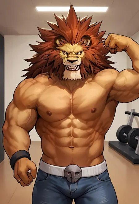 关键词:["狮子头,体型健壮,狮子耳朵,圆耳,ABS,毛发浓密的男性,黄眼睛,肌肉发达的身体,红发,鬃毛, bara,1个男孩,肌肉男性"]