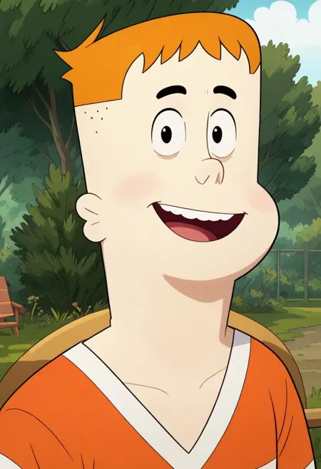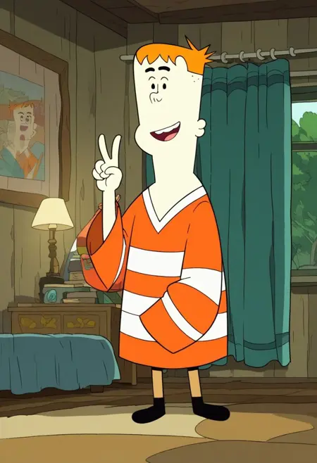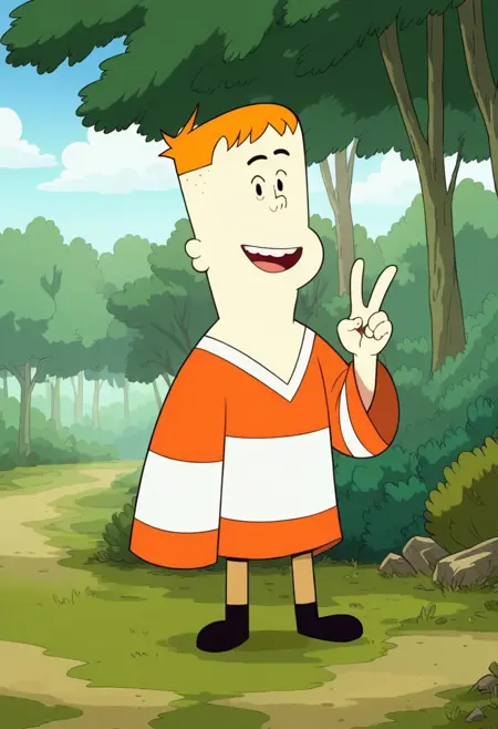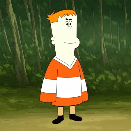 트리거 단어: 1boy, solo, JP_Cotc, 밝은 피부, 검은 눈, 작은 눈, 검은 눈썹, 주황색 머리, 짧은 머리, 긴 소매 주황-흰색 줄무늬, V넥 하키 저지, 황갈색 바지, 검은 신발