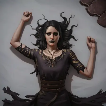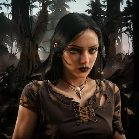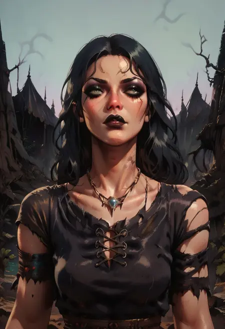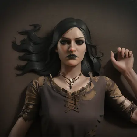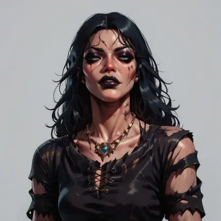 Poe2WitchV0.1, black lips, black lipstick, makeup, black hair, long hair jewelry, necklace, torn clothes,