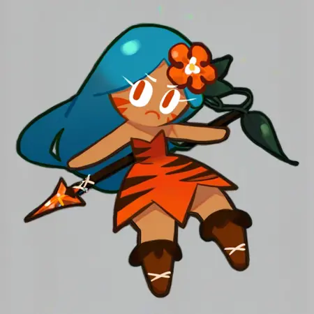 tiger lily, red eyes, blue hair, red face paint, tiger dress, boots, spear, flower