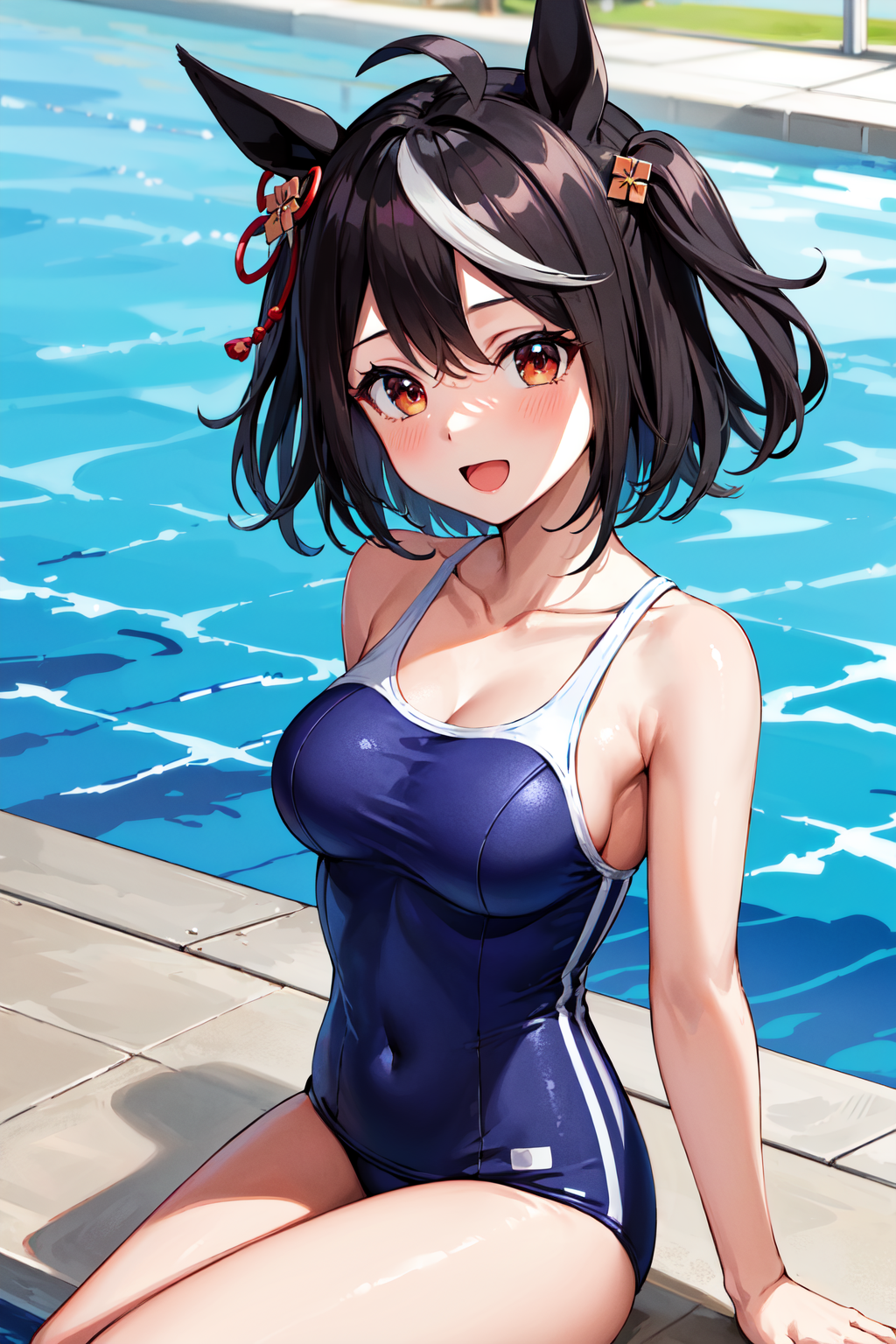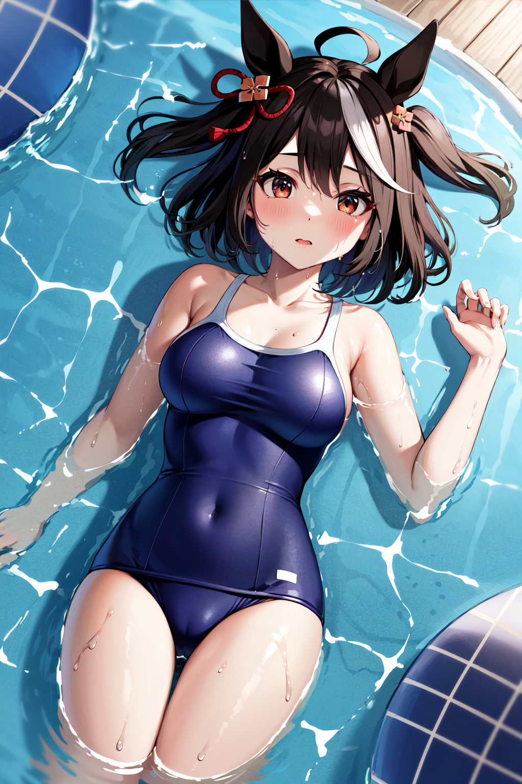 bbkitasan, animal ears, short hair, streaked hair, hair ornament, horse tail, medium breasts, school swimsuit, blue one-piece swimsuit, bare shoulders