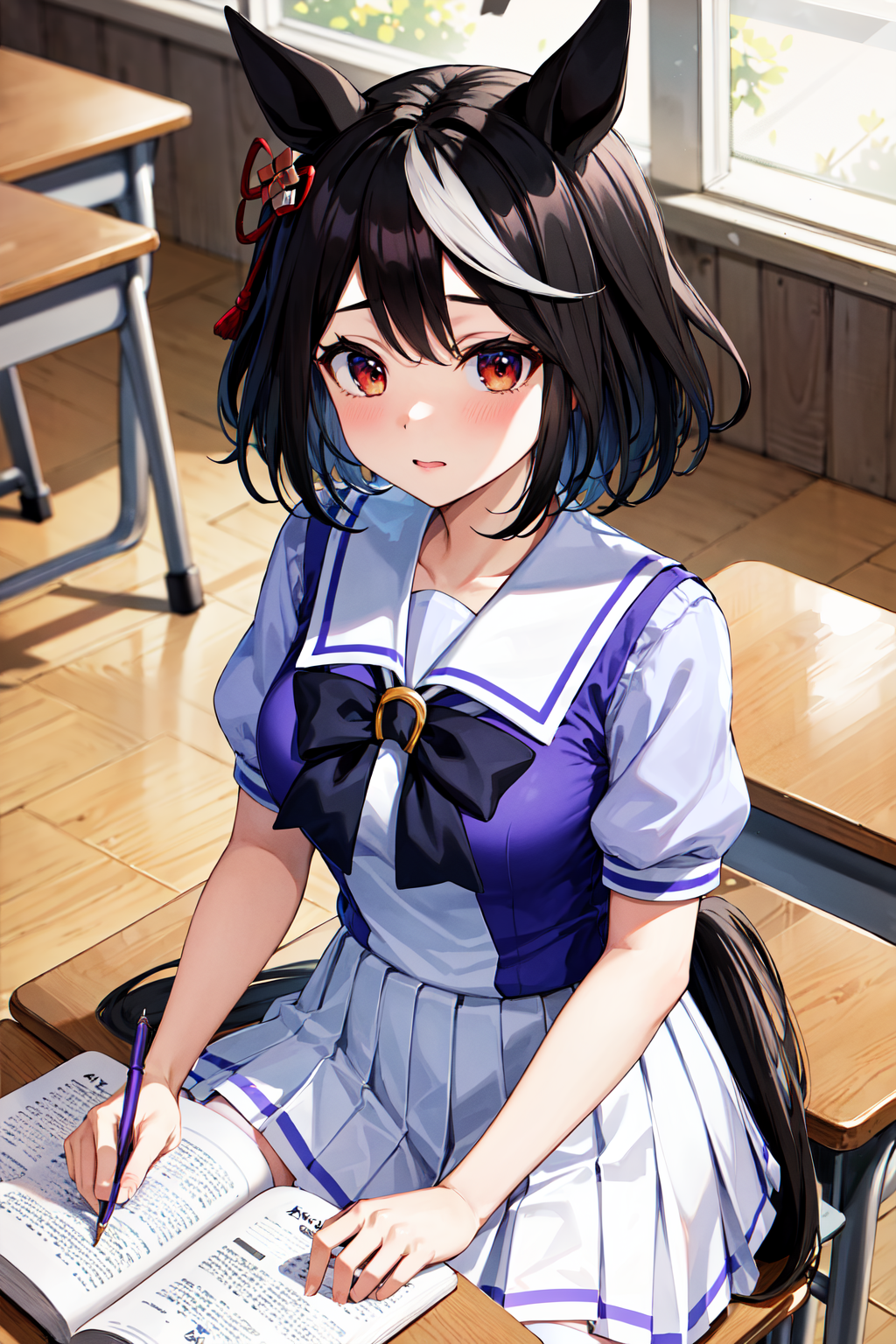 bbkitasan, animal ears, short hair, streaked hair, hair ornament, horse tail, tracen school uniform, sailor collar, purple shirt, sailor shirt, purple bowtie, short sleeves, white skirt, pleated skirt, white thighhighs