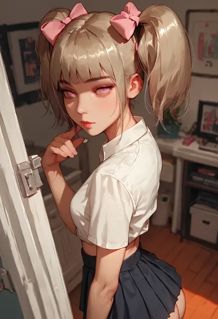 ruri_cnr, 1girl,pink eyes, blunt bangs, long hair, ponytail,grey hair,sidelocks,medium breasts,