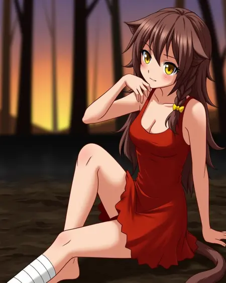 年轻女性,红色连衣裙,坐在林中空地,森林,数字绘画,傍晚,日落,夏季,lora:apfluxgymyvau20241122-step00001800:0.8, YVAU, 1girl, catgirl, 棕色头发,猫耳,黄眼睛,双马尾,双马尾上黄色蝴蝶结,猫尾巴,腿上白色绷带
