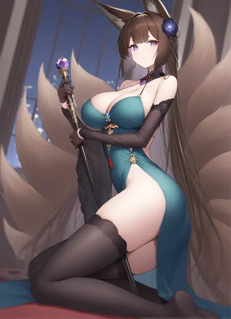 落于王座之花(throne_of_fallen_petals):amagi \(azur lane\),hair flower,long hair,brown hair,purple eyes, fox ears, multiple tails,large breasts,detached sleeves,halter dress,gloves,black thighhighs
