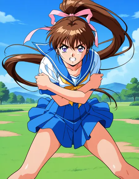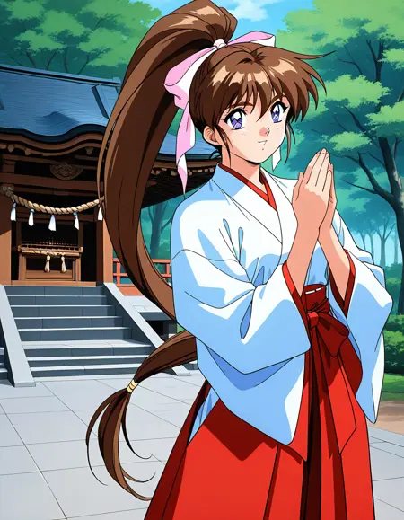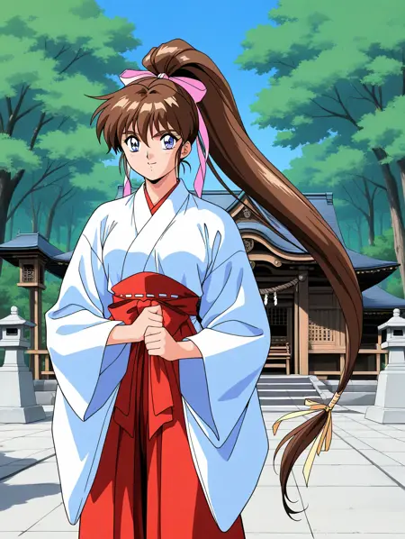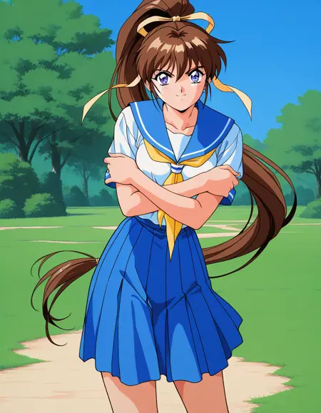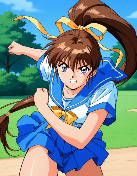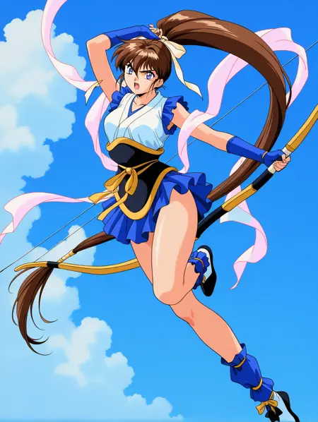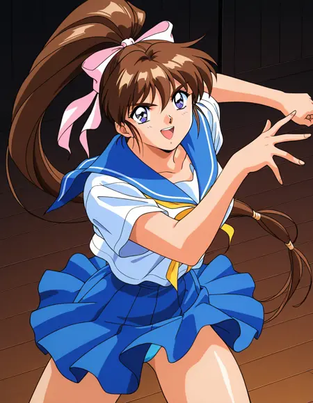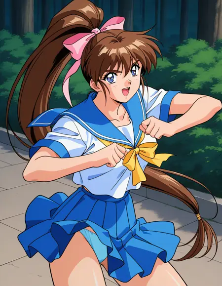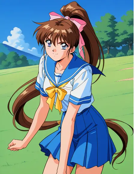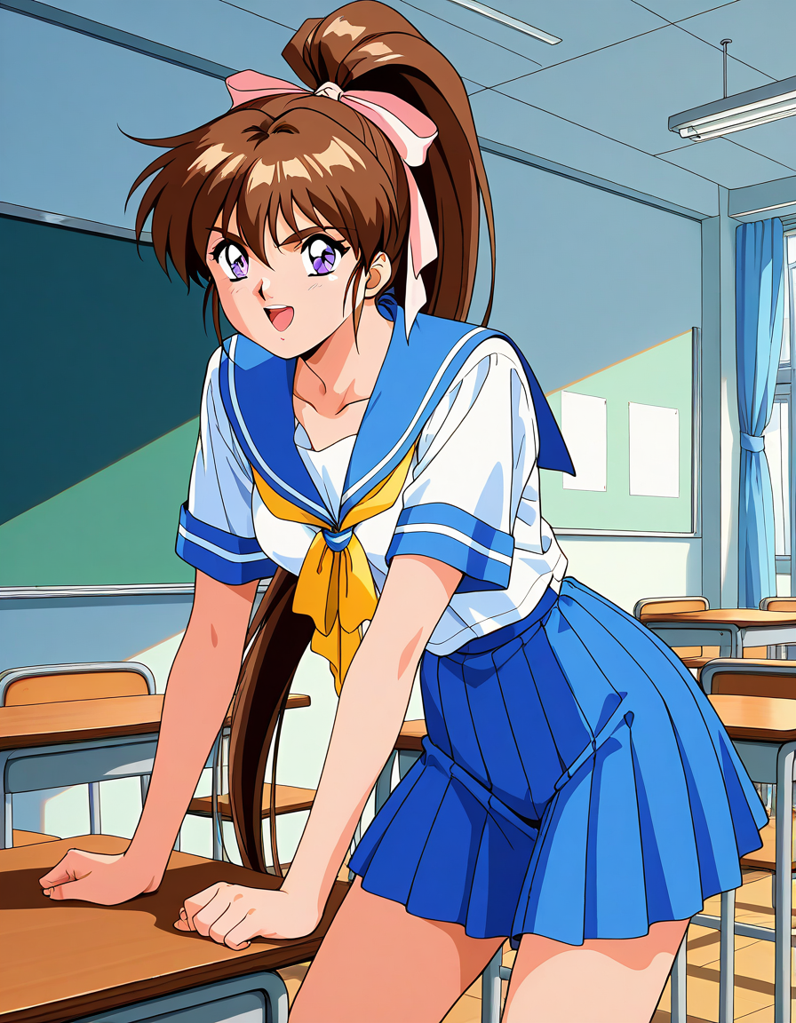 Amatsu_Ai, brown hair, ponytail, very long hair, ribbon, hair ribbon, hair bow, breasts, blue eyes, bangs, purple eyes, high ponytail, 1990s \(style\),anime coloring,