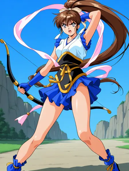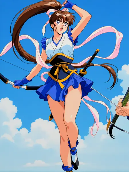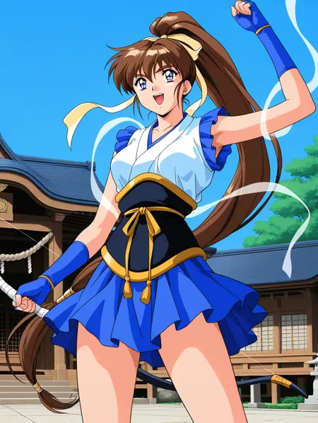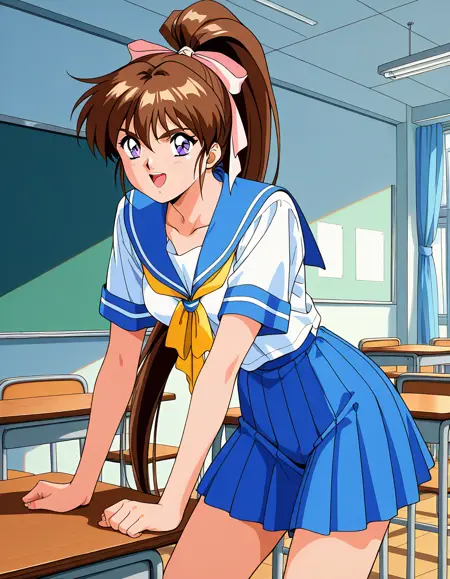 Amatsu_Ai,棕色头发,马尾辫,长发至地,发带,发饰蝴蝶结,胸部,蓝色眼睛,刘海,紫色眼睛,高马尾,1990年代风格,动漫着色,
