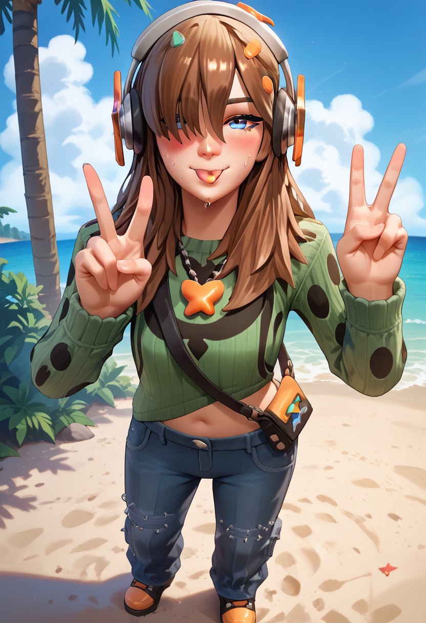 PJFortnite,蓝眼睛,棕色头发,长发,发饰,耳机,项链,绿色毛衣,长袖,包,肚脐,牛仔裤,黑鞋