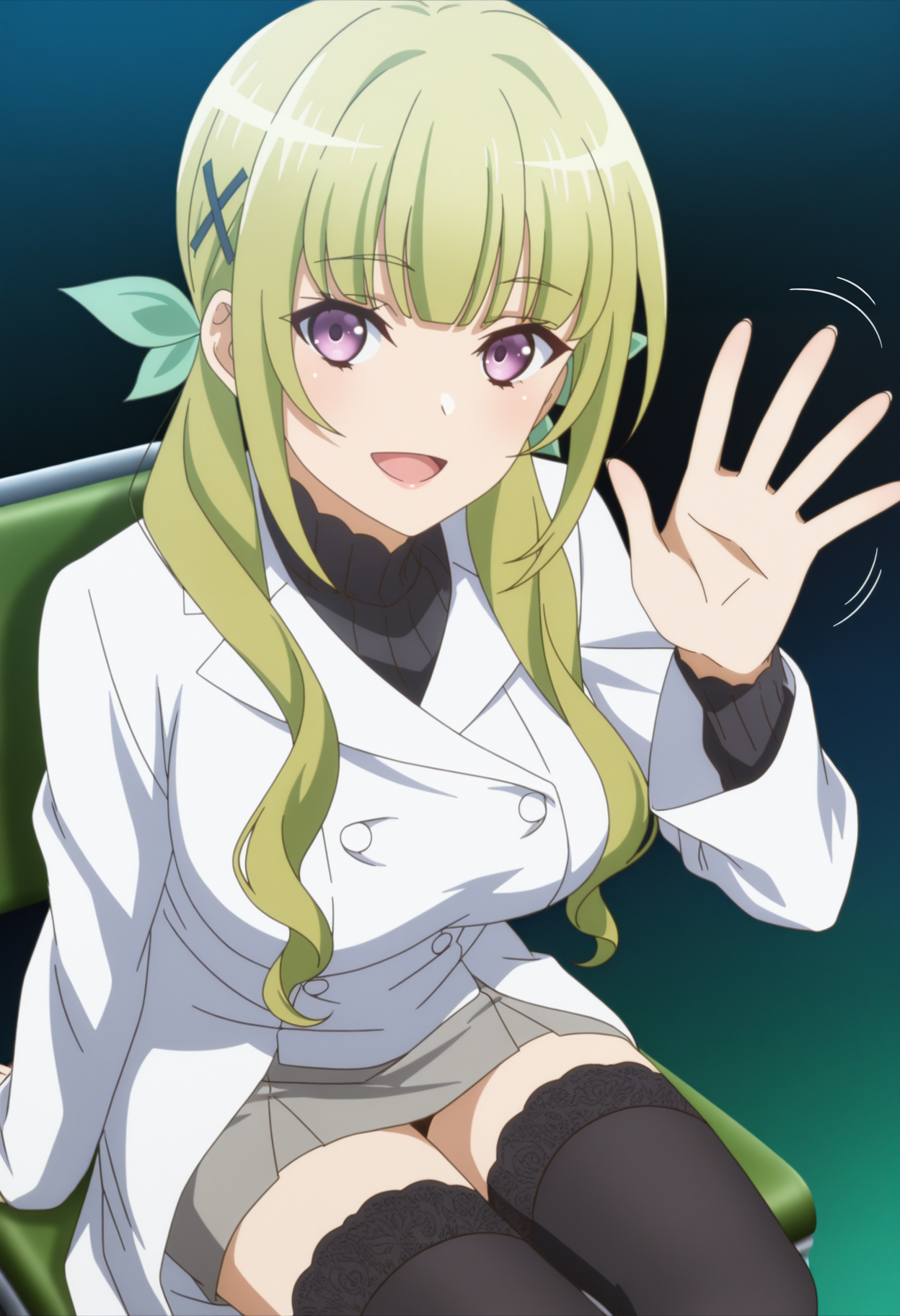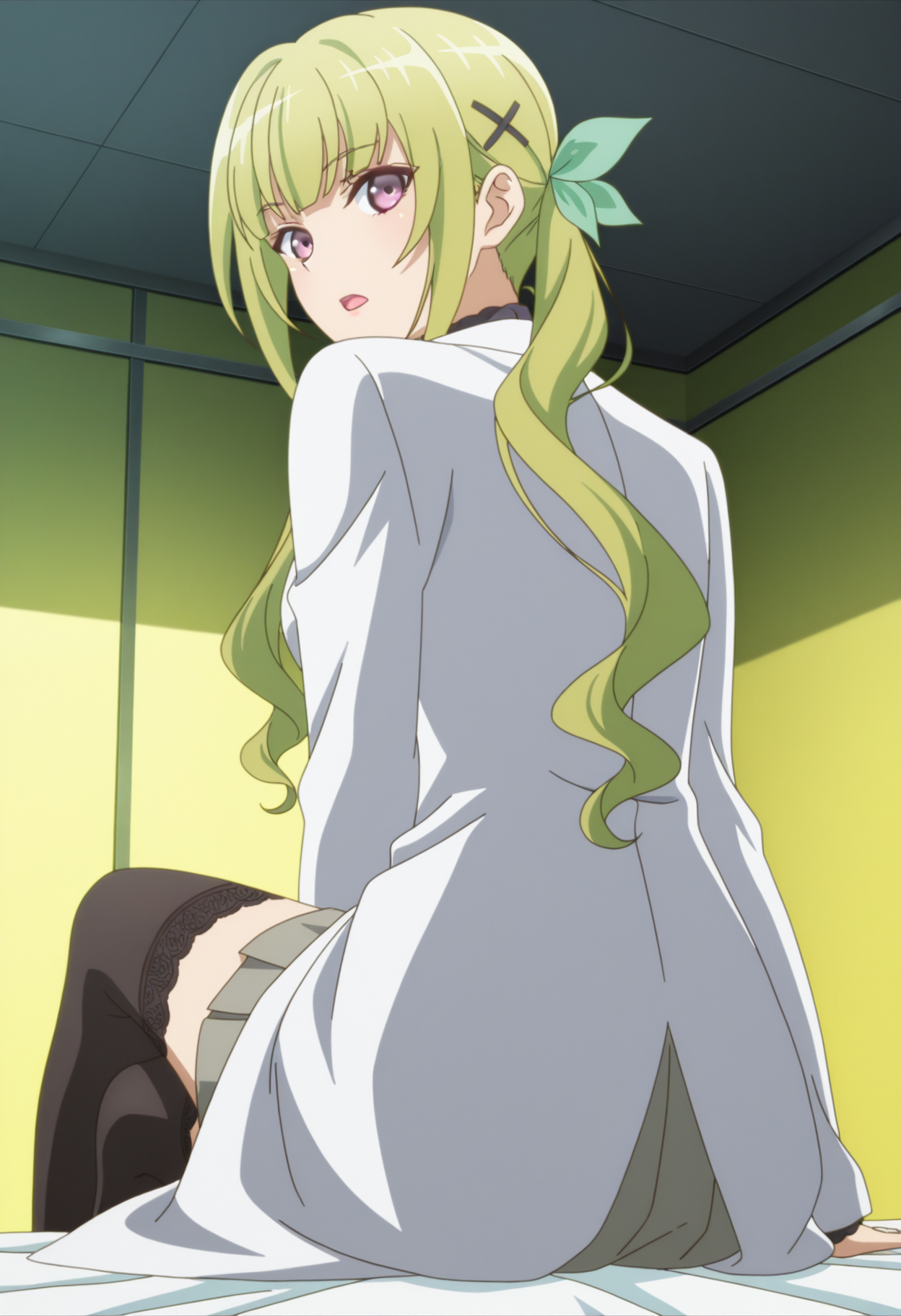 - black thighhighs,gray skirt,green hair,lab coat,hair ribbon