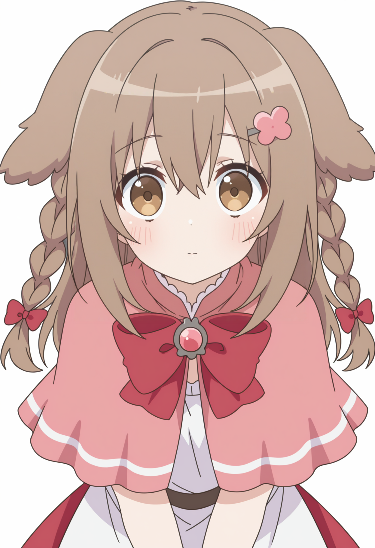 • 犬の耳、ホワイトの太ももハイソックス、ピンクのカプリ、ヘアオーナメント、レッドのリボン、チュニック