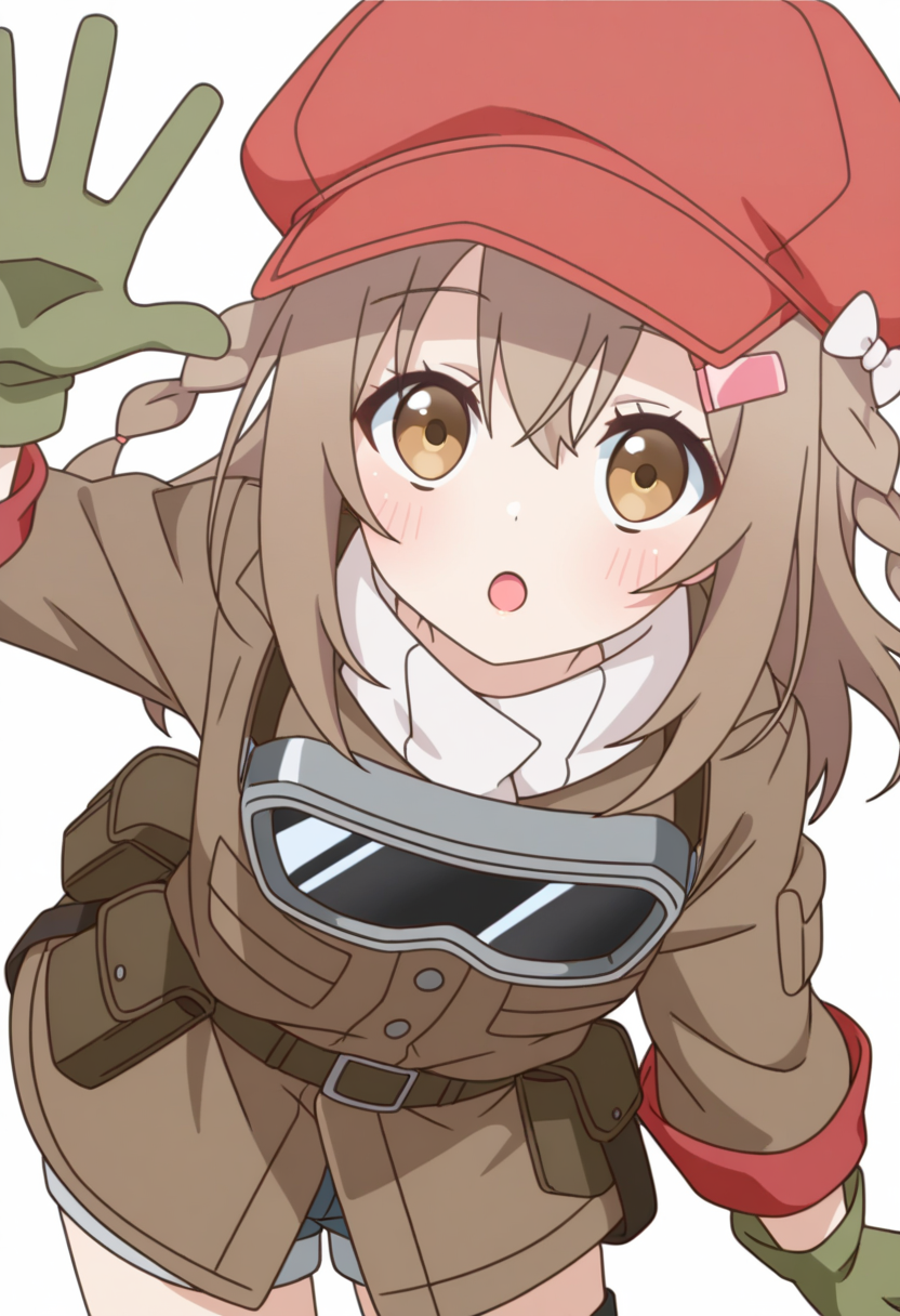 • グリーンの手袋、レッドの帽子、ヘアオーナメント、ブラウンのジャケット、首に巻いたゴーグル