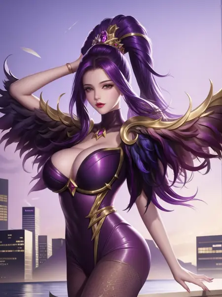 - WZRYmiyueYP, 1girl, solo,breasts, looking at viewer, purple hair, headgear, wings, red eyes, large breasts, cityscape, night, mature female, pool, asymmetrical legwear, bodysuit, hand on hip,clothing cutout, makeup, cowboy shot, eyelashes, long hair, seductive smile,