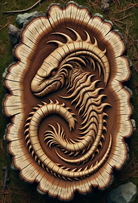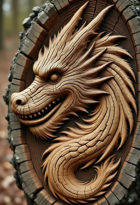 • 展示由树干制成的、细节丰富的木质雕刻(主体)的摄影作品。