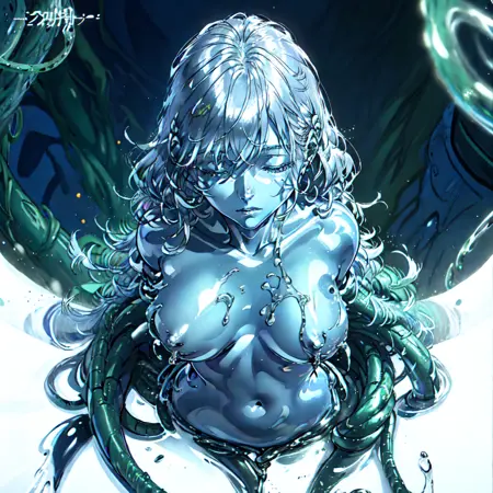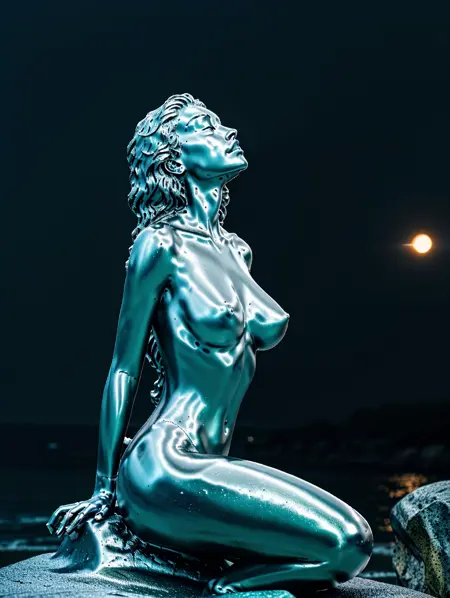 petrification, closed eyes, shiny skin, shiny hair, brilliant, statue, shiny silver (skin/hair/face/~), nude, completely nude, monochrome, etc.