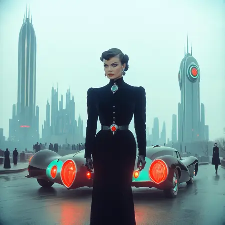 This LoRA aesthetic is something that never existed - 1940s Cyberpunk viewed through the vibrant lens of Technicolor. Combining retro-futuristic elements with the classic film noir mood of the 1940s.