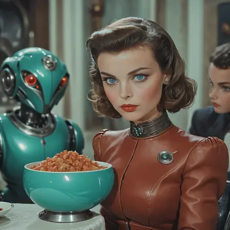 The trigger words are ArsMovieStill, movie still from a technicolor 1940s cyberpunk film.
