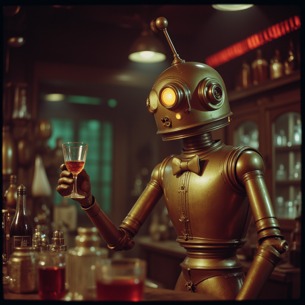 トリガー語は ArsMovieStill, movie still from a technicolor 1940s cyberpunk film. です。