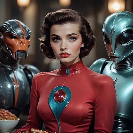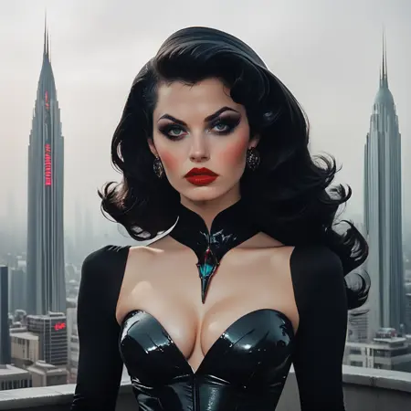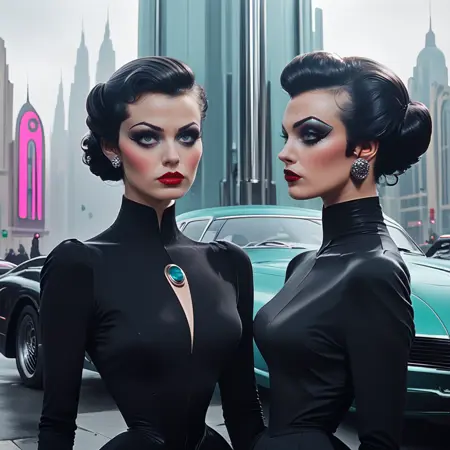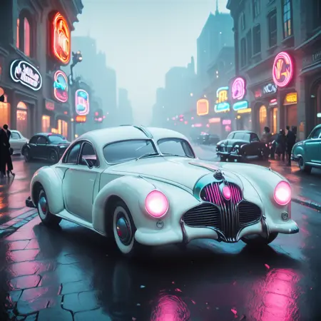 이 LoRA의 미학은 결코 존재하지 않았던 것입니다—테크니컬러의 생동감 있는 렌즈를 통해 본 1940년대 사이버펑크. 1940년대의 고전적인 영화 Noir 분위기와 레트로-퓨처리스틱 요소를 결합했습니다.