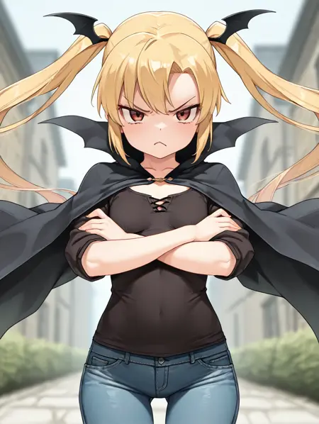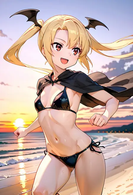 香草,金色头发,头部翅膀,双马尾,吸血鬼,红眼睛,黑色斗篷,白色内裤,平坦胸部