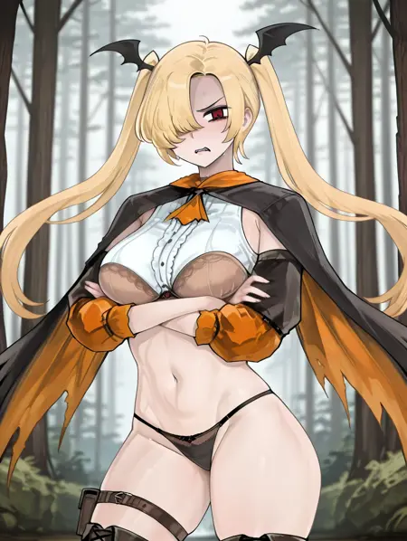 香草成年版,金色头发,头发遮住一只眼睛,吸血鬼,头部翅膀,双马尾,红眼睛,大胸部,黑色斗篷,橙色斗篷,黑色内裤,白色短上衣,黑色袖子,橙色袖子,棕色文胸,内衣外露,大腿绑带,过膝长靴