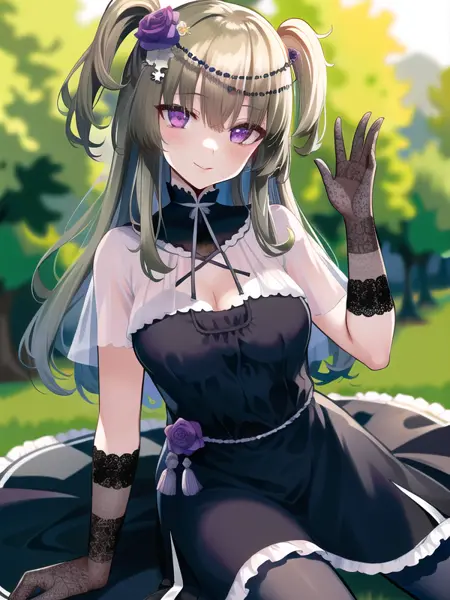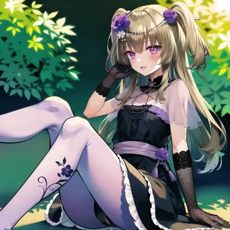meimei_himari,flaxen hair,two said up,long hair,purple eyes,dark dress,sleeveless,purple pantyhose,sash long glove,black high heel