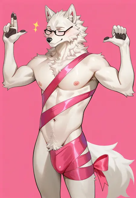 _ Extended Prompt: male focus, solo, naked ribbon, chin up, hands up, closes eyes, one eye closed, muscular, muscular male, nipples, pectorals, abs, hairy, chest hair, armpit hair, pubic hair, smirk.