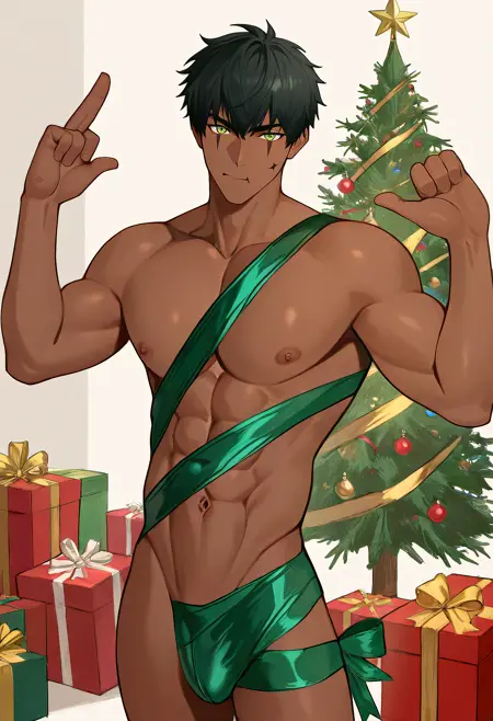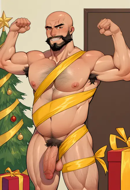 Extended Prompt: male focus, solo, naked ribbon, bara, muscular, muscular male, nipples, pectorals, abs, pubic hair, smirk