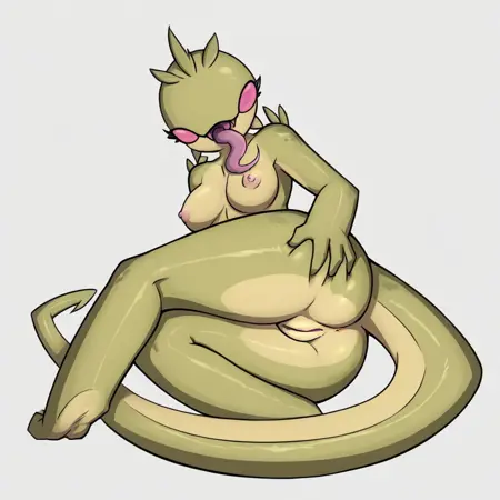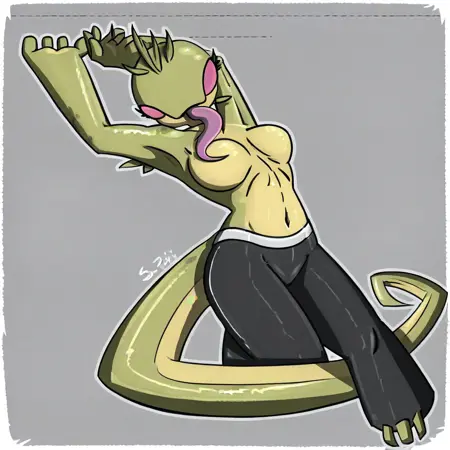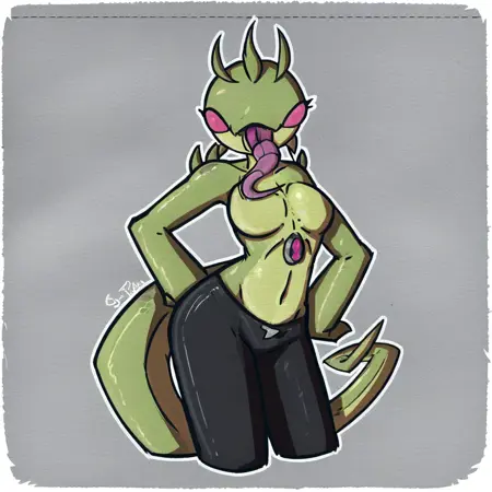 Spitter_(chaquetrix), alien, female, green skin, no pupils, long tongue, black pants, chaquetrix on stomach