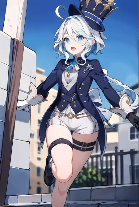 以下のトリガー単語を使って、キャラクターの公式服の要素を生成できます:top hat, tailcoat, short shorts, boots