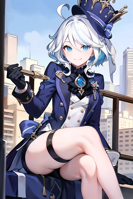 你可以用以下触发词生成角色公式服组件:top hat, tailcoat, short shorts, boots